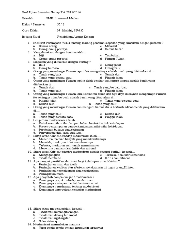soal ujian agama kristen protestan semester 2 kelas 10